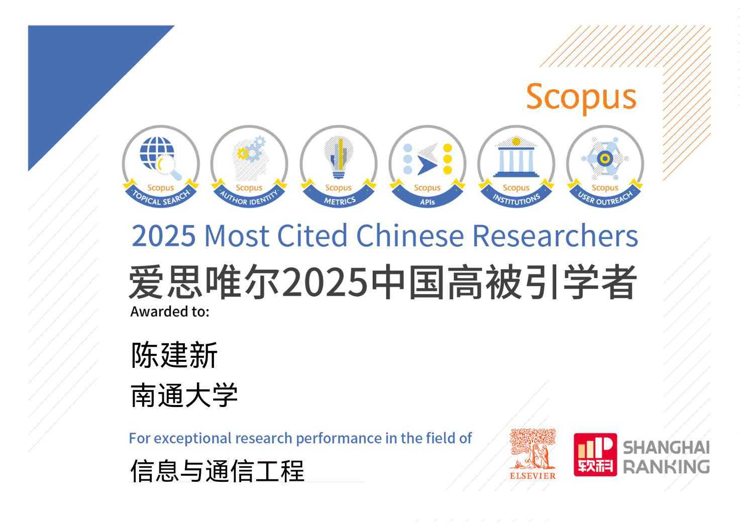 1月30日,国际知名学术出版机构爱思唯尔(Elsevier)发布2025年“中国高被引学者”(Highly Cited Chinese Researchers)榜单。公司陈建新教授继2024年入选后,2025年再次成功入选,蝉联此项重要学术荣誉。